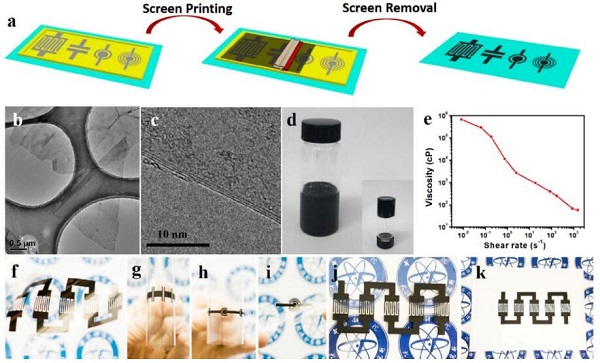 (e) 石墨烯基油墨粘度随剪切速率的变化。