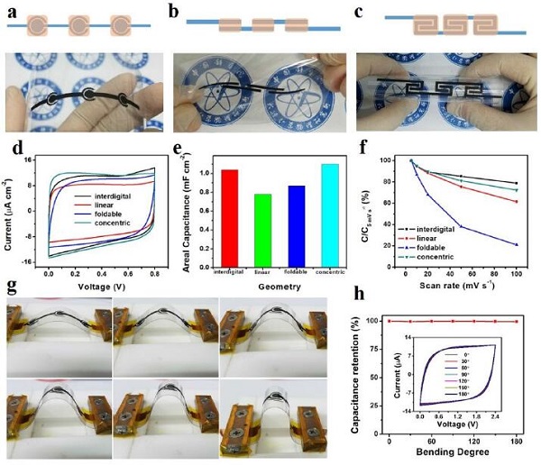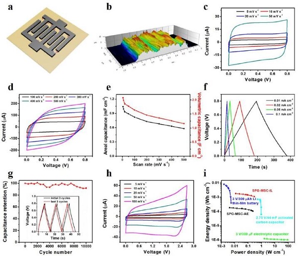 (d, e) 不同平面构型单个SPG-MSCs在5 mV s-1扫描速率下的CV曲线和面积比容量。