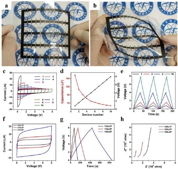 图4. 以10串联为一组,5组并联集成(10S×5P)方式的SPG-IMSCs的电化学性能