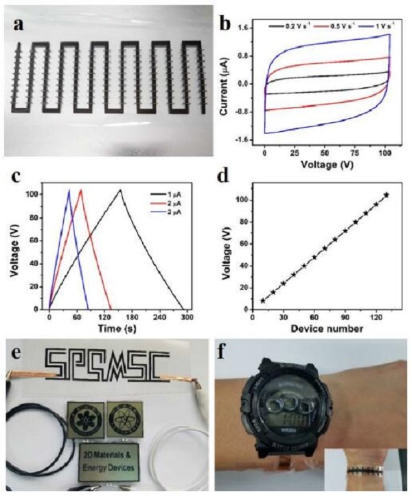 (f) 8个器件串联的SPG-IMSCs模块给运动手表供电。插图: 给手表供电的SPG-IMSC器件照片。