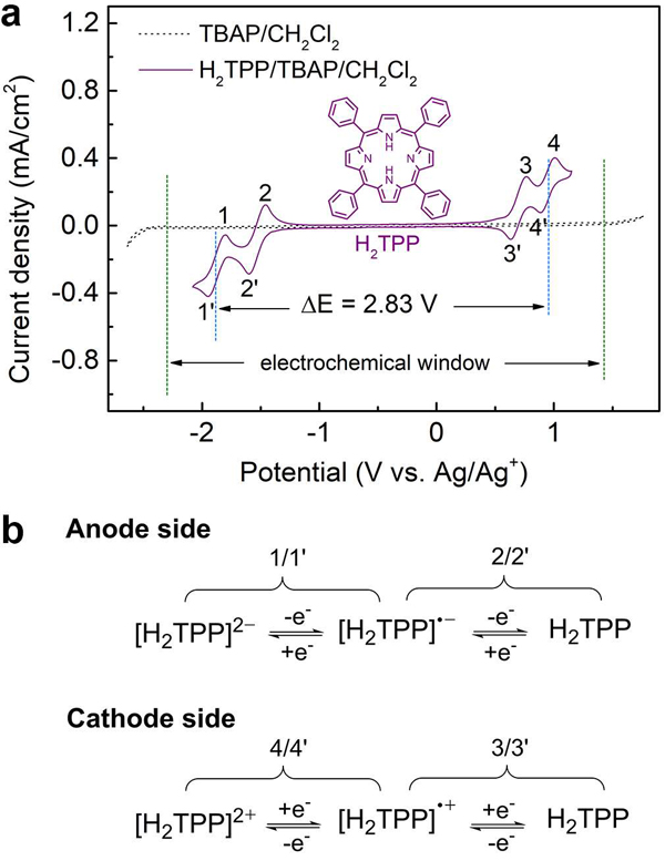 陈军院士(通讯作者)课题组的带领下,构建了基于5,10,15,20-四苯基卟啉(H2TPP)的非水有机RFB 作为双极性氧化还原活性材料(阳极:[H2TPP]2-/H2TPP,阴极:H2TPP/[H2TPP]2+)和具有高离子电导率的Y型沸石-聚偏二氟乙烯(Y-PVDF)离子选择膜作为隔膜。卟啉作为RFB的活性物质,源于分子环具有良好导电性和可逆氧化/还原稳定性的芳族π共轭大环。而Y-PVDF离子选择膜的分离器保留了H2TPP以及氧化还原产物,并且由于微孔排阻效应,允许ClO4–而不是TBA+运输。所构建的RFB在20〜-40°C的温度范围内具有8.72 AhL-1的高容量和2.83 V的高电压以及出色的循环稳定性(每次循环容量保持率超过99.98%)。相关成果以题为“Porphyrin-Based Symmetric Redox-Flow Batteries towards Cold-Climate Energy Storage”发表在了Angew. Chem. Int. Ed.上。