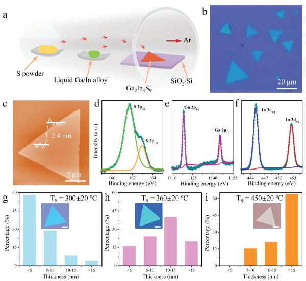 a) 利用液态Ga/In合金和硫粉前驱体生长2D Ga2In4S9的示意图;