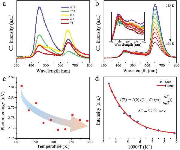 c) 根据b图中CL测试所得的450 nm处带隙能随温度的变化;