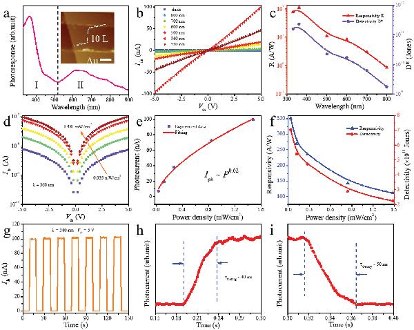 f) 根据e图中在Vds = 5 V时测量的光电流计算所得响应度和检测率;