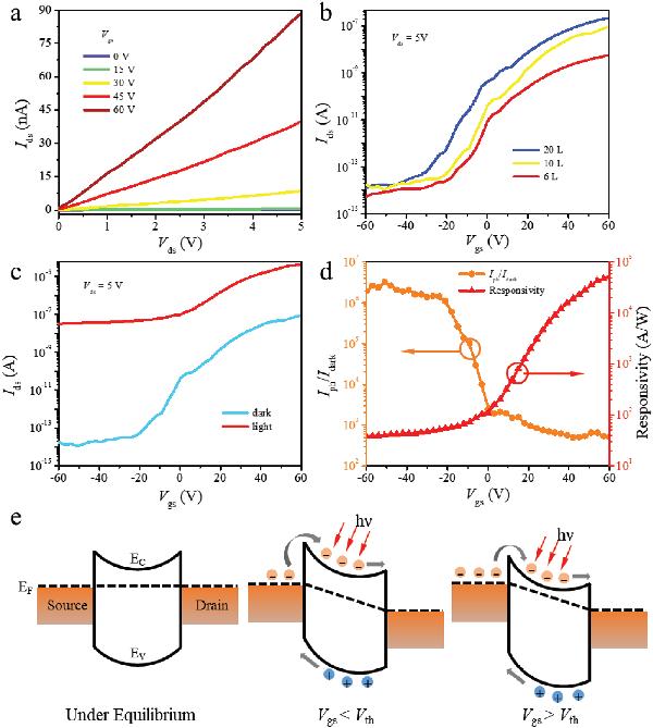 c) Vds = 5 V时,暗处和360 nm光下的Ids-Vgs曲线;