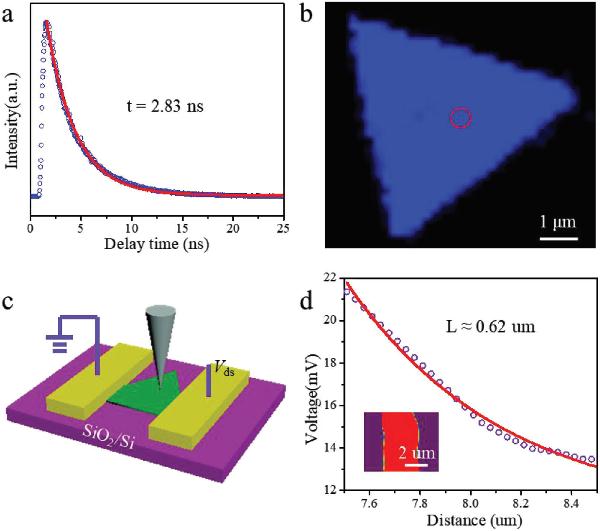 d) 典型的光电流衰减长度(蓝色圆圈),红线为单指数拟合。