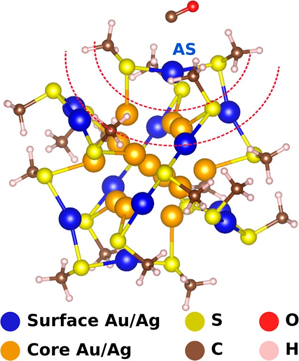 CO/Au25体系的示意图,其中两个相邻层的假设边界以红色虚线表示,AS代表CO吸附位点,表面上的Au/Ag原子吸附位点以蓝色表示,由于空间位阻CO难以接近的核心Au/Ag位点以橙色表示。