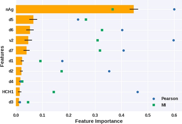 随机森林选择的特征按重要程度排列以及相应的Pearson相关系数和互信息值。