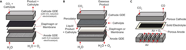 气体传输电极的结构设计对于第二类电解池至关重要。而催化剂在碳层内的安置对于气体传输电极的性能有着实质性影响。通常气这类电极通过将含有催化剂粉末和粘合剂的悬浮液喷涂到电极材料上制备而来。这一类使用气态二氧化碳作为原物料的室温电解池的一个关键的优势在于其维持高电流密度、高持久性、高能量效率的能力,而这些都是衡量一个二氧化碳电还原系统的关键参数。但是,不利的一点在于改变阴极的气态二氧化碳原物料对于催化剂、膜和电极表面的酸碱度都可能有不利影响。