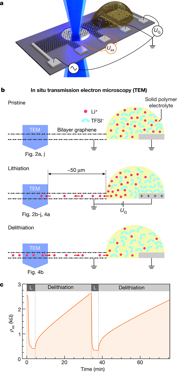 石墨烯是锂离子可逆电池的主体材料,然而使用原位透射电子显微镜很难观察到锂,因此,如何利用原位透射电子显微镜观察到锂在石墨烯中的排列方式至关重要。