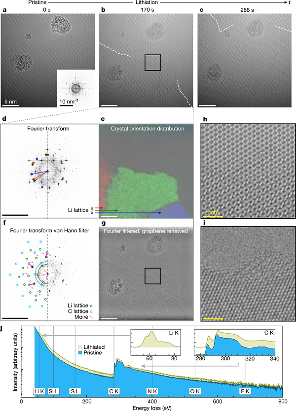 (h, i) b, g方块区域的放大图示,显示Li晶体的边缘