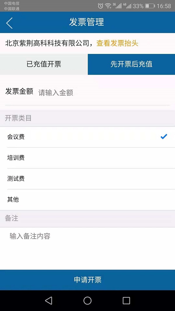 2:点击申请开票,选择“先开票后充值”,填写相应信息后提交