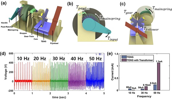 在这一部分中,作者回顾了先前研究人员提出的各种TENGs动能转换系统。这篇综述将这些系统分为四个不同的类别:基于1)齿轮系、2)凸轮从动件、3)桁架和4)螺旋弹簧的TENGs。以前,动力学系统与大量发电集成在一起,例如利用蓝色能量的发电厂。这篇综述集中于TENGs的动力学系统,并展示了机械系统对TENGs发展的重要性。