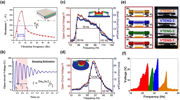 实验确定振动TENG (a)带宽和(b)阻尼的方法。具有(c)面外运动和(d)面内运动的多方向TENG的电压和电流输出频率响应。(e)串联TENG系统设计,具有垂直堆叠布置。战略设计的串联TENG的电压输出频率响应。