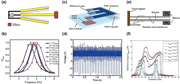 (a)具有尖端质量的双冲击悬臂TENG示意图,以及(b)不同悬臂长度和尖端质量下的相应输出频率响应。(c)调整悬臂梁的长度在不同频率下工作的悬臂梁示意图,以及(d) 15 Hz谐振频率下最长悬臂梁的TENG输出(e)具有非线性冲击的双共振结构悬臂梁示意图,以及(f)在不同输入加速度下的功率输出频率响应。