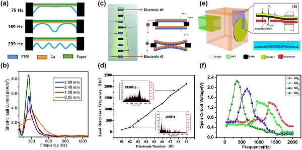 TENG的基于固定梁弹簧的振动能量转换系统。(a) PTFE膜振动频率模式的图示,以及(b)不同纸张厚度下的电流输出频率响应。(c)频率选择性TENG及其操作示意图,其中振动PTFE膜连接到九个电极上。(d)电极数量与PTFE膜局部共振频率之间关系的结果。(e)四个TENG的声能采集示意图和(f)输出频率响应。
