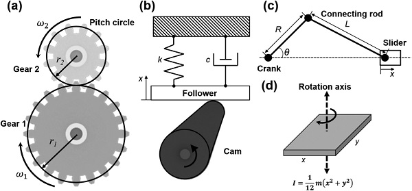 (a)齿轮,(b)凸轮从动件,(c)曲柄滑块,(d)矩形飞轮