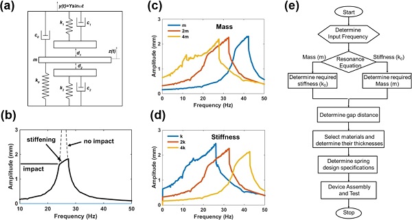 (a)两侧带有挡板的振动系统的分段模型。振幅频率响应模拟显示了(b)由于冲击导致的硬化现象,(c)共振频率位置随质量增加而向左偏移,以及(d)共振频率位置随刚度增加而向右偏移。(e)振动系统的共振设计协议。