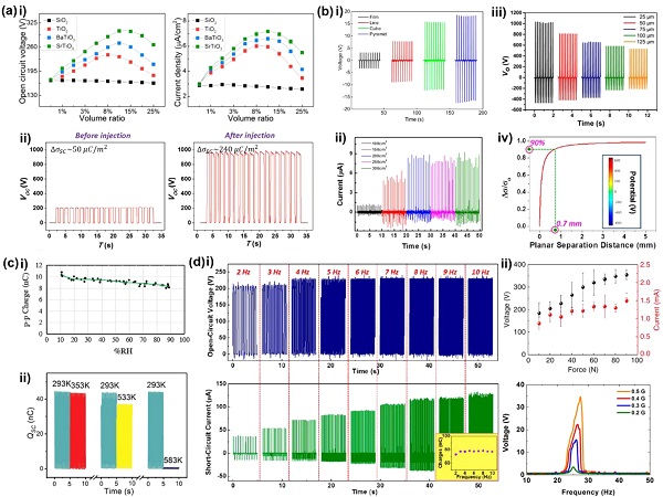 TENG性能随各种参数变化: (a)与i)相对介电常数和ii)表面电荷密度相关的材料特性;(b)几何形状,包括i)表面形态,ii)接触面积,iii)电介质厚度,以及iv)间隙距离;(c)环境条件,包括i)相对湿度和ii)温度;和(d)确定i)接触频率和ii)接触力的输入能量水平。