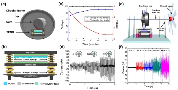 (a)基于凸轮从动机理的TENG系统示意图和(b)从动件结构。(c)基于垂直接触分离和侧向滑动模式的TENGs的机械耐久性。(d)基于凸轮的TENGs的输出电流,凸轮前端的数量变化。(e)基于凸轮的风车TENG系统和(f)不同风速下的输出电流示意图。