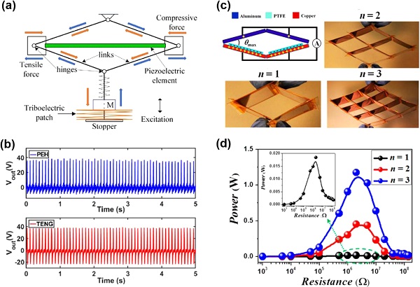 (a)基于桁架结构的PE-TE混合发电机的动力学分析。(b) PNG和TENG使用输入频率为11 Hz的桁架结构的输出性能。(c)菱形网格结构TENG的示意图,以及(d)其输出功率随单元数量变化的示意图。