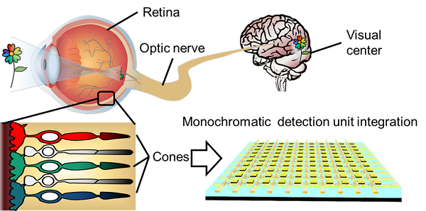 人类视觉系统对于事物的感知基于层视网膜,而真正接收光信号的是位于视网膜内部的视锥细胞,它响应波段主要在于蓝光、绿光、红光。这些视锥细胞收到光的刺激之后,将不同的光信号转换成不同的电信号通过视觉神经传输到大脑,大脑经过信息处理还原所感知的图片。受这样一种视锥细胞的启发,我们希望将不同波段响应的窄带探测器集成到一个器件阵列上,从而同时实现类似于人眼的颜色和图像的识别系统。