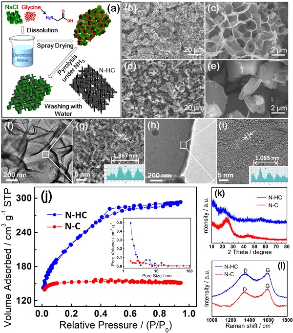 (j)氮物理吸附等温线和(插图) N-HC和N-C的孔径分布,(k) XRD图和(l) N-HC和N-C的拉曼光谱。