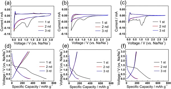 (a) N-HC, (b) N-C和(c) HC在0.1 mV s-1扫描速率下的循环伏安图,以及(d) N-HC, (e) N-C和(f)HC在50 mA g-1电流密度下的恒流充放电曲线。