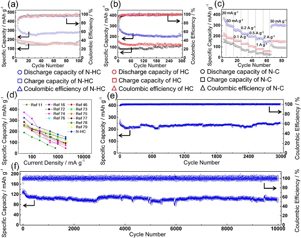 (d) N-HC和其他碳材料对SIBs的性能对比;N- HC在电流密度为(e) 500 mA g-1和(f) 5000 mA g-1时的循环性能。