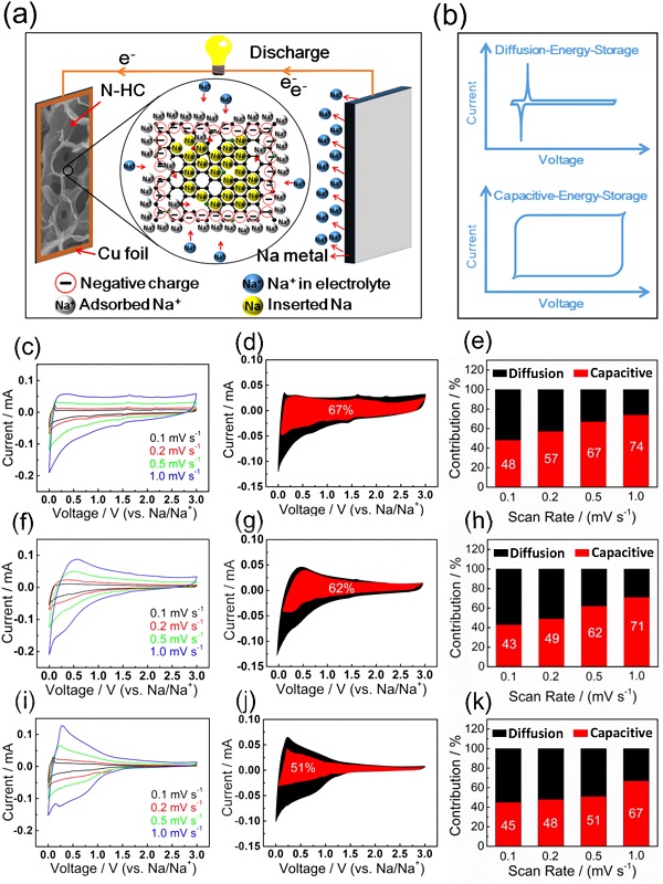 (a)放电期间N-HC的扩散储能和电容储能过程示意图;