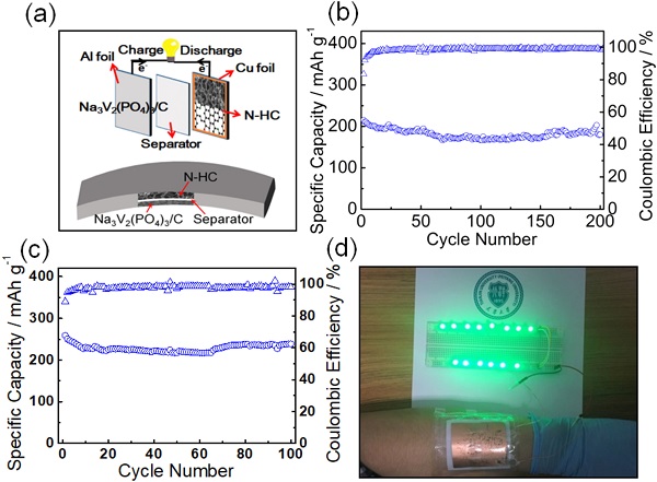 (a) 由N-HC和商业的Na3V2(PO4)3/C组成的全电池和可穿戴全电池;