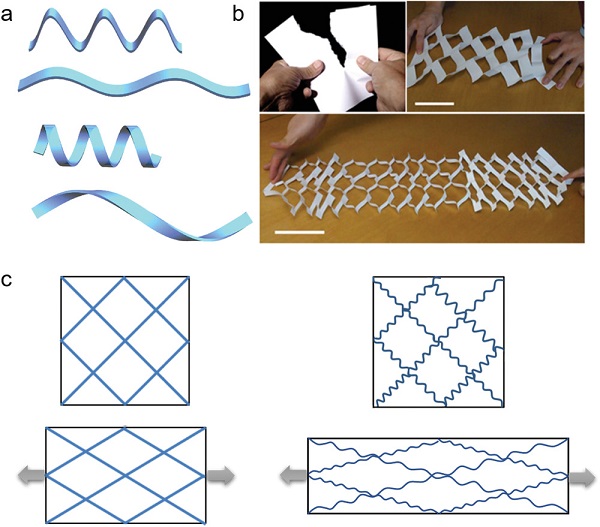 Figure 2. (a)可拉伸的1D结构:波浪形(上部)和弹簧形(下部);(b)通过kirigami(剪纸艺术)切割设计网络结构,实现硬质不可拉伸材料(如纸张)的可拉伸性能;(c)具有直线(左)和蛇形(右)结构的可拉伸网络结构,后者显示出更高的可拉伸性能。