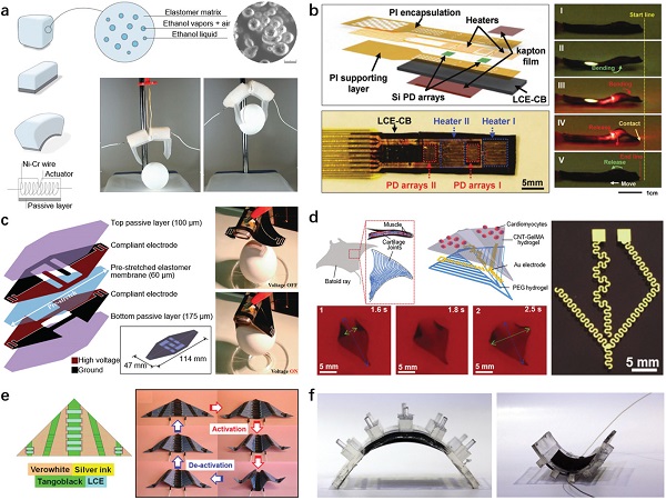 Figure 9. 离子材料作为柔性透明电极用于介电弹性体软体机器人应用示例。