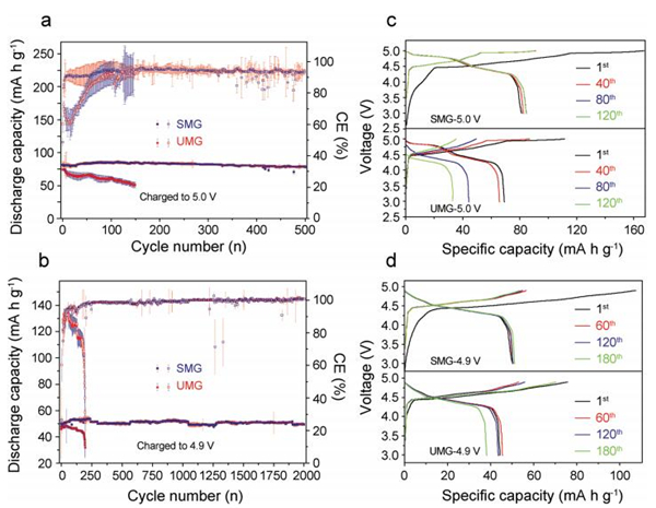 (c,d)在5.0 V(c)和4.9 V(d)的上截止电压和200 mA g-1的电流密度下,不同循环圈数时Li//SMG和Li//UMG的充放电曲线图。