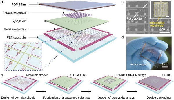 研究人员已经展示了基于CH3NH3PbI3−xClx薄膜的大规模柔性光电探测器阵列用于实时光探测和成像,该器件在多种环境下具有的优异性能而使其成为新型光电探测器的一种较为理想的装置,相关研究人员也预测所制备的这种器件在光通信、数字显示和人造电子皮肤等领域的光探测和成像方面具有巨大的潜力。