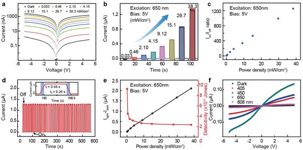 (a)利用650 nm激光二极管对单像素在黑暗和光照下进行表征(对数I-V曲线),其光强度变化范围为0.033-38.3 mW cm-2