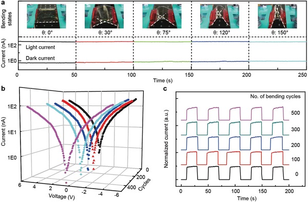 (a)偏压为5 V,分别在黑暗和光照强度为6.5 mW cm-2下具有不同弯曲角度的器件输出电流,插图是5种弯曲状态下器件所对应的光学图像,θ是弯曲角