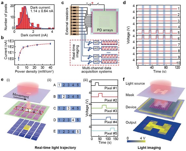 (e)实时光追踪演示:(e-i)光点移动过程的示意图和(e-ii)对应的轨迹,(e-iii)当光点通过对应的像素点时终端电压的变化