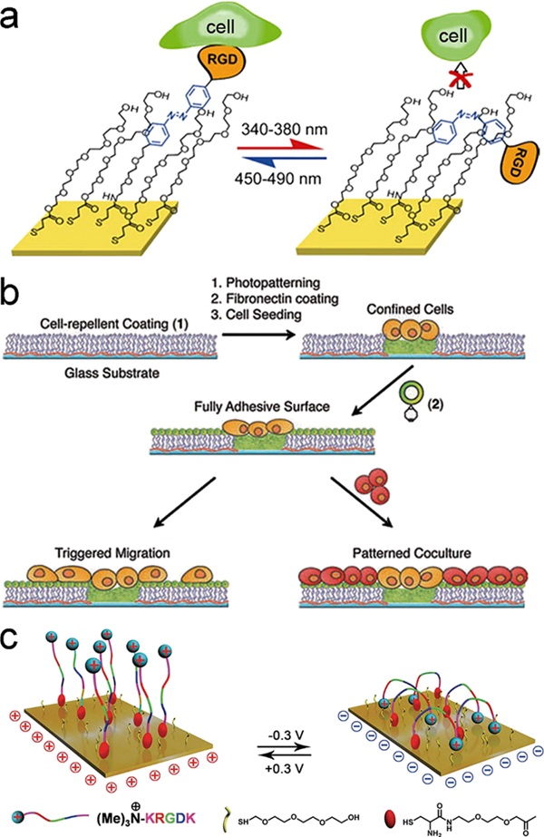 (c).通过电位控制RGD多肽构象从而控制细胞的可逆粘附