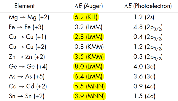 图11 一些元素的俄歇谱线位移和光电子谱线位移对比[36]