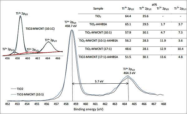 图12 TiO2-MWCNT (10:1)表面功能化修饰前后Ti 2p的高分辨率XPS谱图[41]