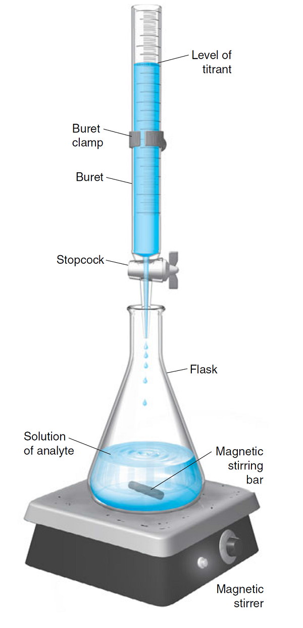 滴定法又可称为容量分析法。如图1所示,在该法中,滴定标准溶液通过滴定管逐渐加到待测物中,直至反应完全,然后测量消耗的标准溶液的体积就可以计算出待测物质的含量[4]。滴定法要求滴定反应应有足够大的反应平衡常数而且反应速率足够快。即是说,滴加的标准溶液应当与待测物完全而又迅速的发生反应,直至待测物被消耗完毕。常见的滴定法可分为三类:酸碱滴定法、氧化还原滴定法和沉淀滴定法。滴定法不需要特别的仪器,成本低,而且准确性高。