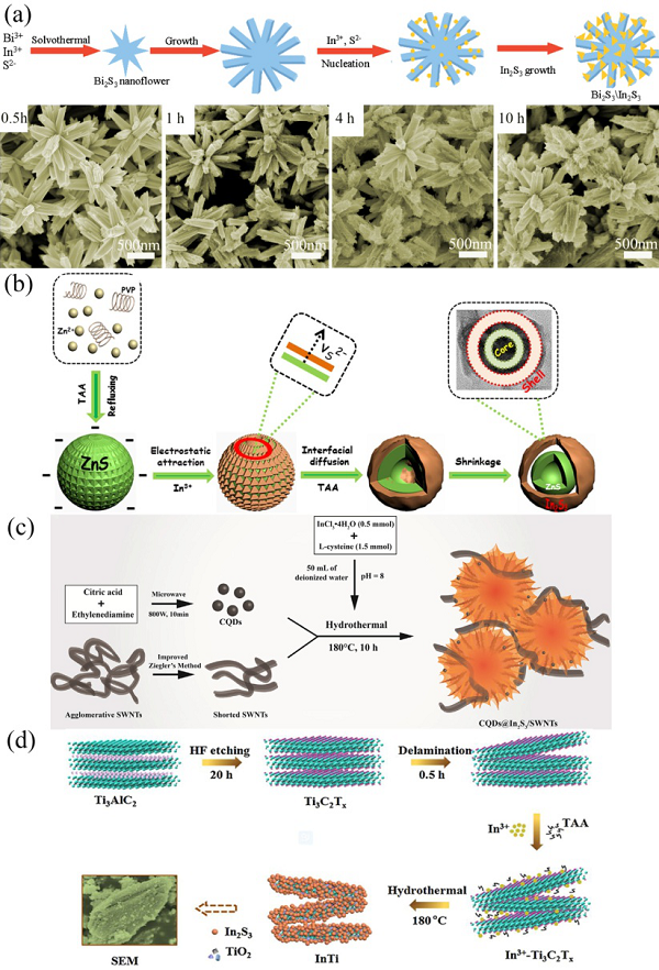 近年来,为了缓解能源短缺和环境问题带来的压力,国内外众多科学家主张利用太阳能来代替一系列不可再生能源,并致力于开发新技术将太阳能高效转化为化学能或电能来解决能源和环境问题。其中,硫化铟作为一种高效的可见光吸收材料,它具有较高的光吸收系数、光敏性、载流子迁移性好、带隙适中、稳定性好、毒性低等众多优点,在光能转换领域得到了广泛的研究。科研工作者开发了各种基于硫化铟的功能性纳米结构,如纳米颗粒、纳米管、二维原子级纳米片和纳米片组装复合物。利用缺陷调构、掺杂和杂交(与无机材料或生物分子)等技术调控硫化铟的光电化学性质,使得基于硫化铟材料的光催化、光电催化和光伏系统全面发展,促进了太阳能源利用在能源和环境问题上的突破。