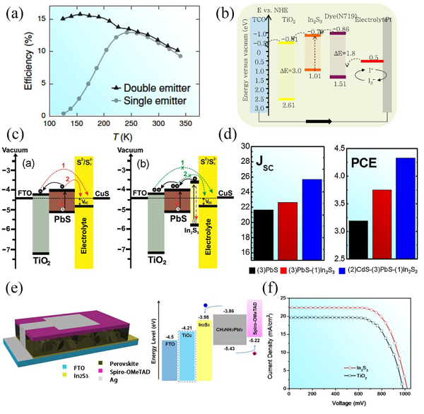 图1.热点材料以及金属硫化物的文献数目对比图,硫化铟基材料的应用饼状图,以及太阳能转换和利用概念图。