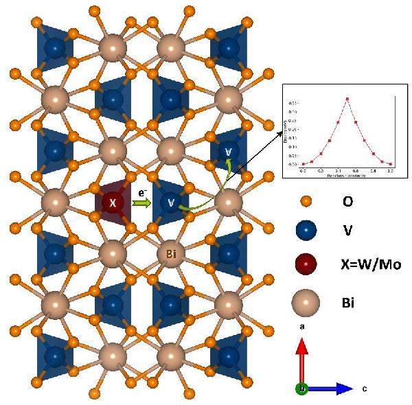 在金属氧化物中,BiVO4(BVO)是迄今为止报道的性能最高的三元金属氧化物光阳极材料之一。活性最优的多晶BVO为单斜-白钨矿结构(ms-BVO),具有较高的光电流密度的理论效率极限。ms-BVO的优异活性应归因于适合分解水的能带结构,即约2.4-2.5eV的间接带隙和合适的热力学析氧反应(OER)电位的有利价带位置。然而,阻碍其实现理论效率的主要因素是电子-空穴易于复合、电荷传输性能差和表面水氧化动力学缓慢等。为了解决上述问题,研究人员已采取了多种策略,包括形貌控制、掺杂以及负载助催化剂等。在上述策略中,以Mo6+或W6+单掺杂或共掺杂BVO中V5+位点可从电荷传输方面有效提高光电催化分解水活性。BVO和(W/Mo)掺杂BVO中的载流子传输的研究已经成为最近许多实验和理论计算研究的主题。