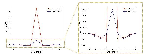 图2 W/Mo上产生的多余电子局域到不同的远离掺杂位点的钒位点时的相对DFT + U能量