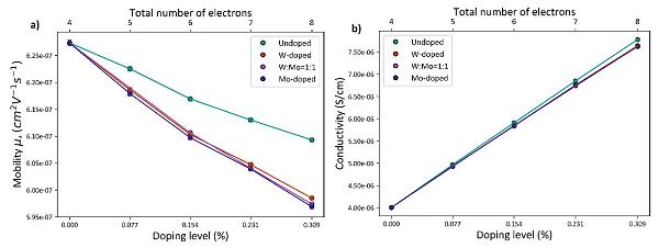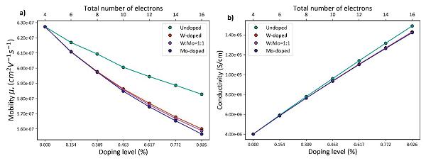 综上所述,作者通过第一性原理方法计算了单个电子空穴传输,包括传输路径以及跃迁活化能,再此基础上,利用介观尺度动力学蒙特卡罗(KMC)方法,模拟了大量电子和空穴的传输行为。研究发现随着载流子数目增加,载流子的扩散系数有所降低,但是掺杂带来体系载流子浓度增高,体系的电导率反而有所提升。这项工作将为研究(W/Mo)掺杂体系和其他掺杂体系中的电子传输奠定基础。