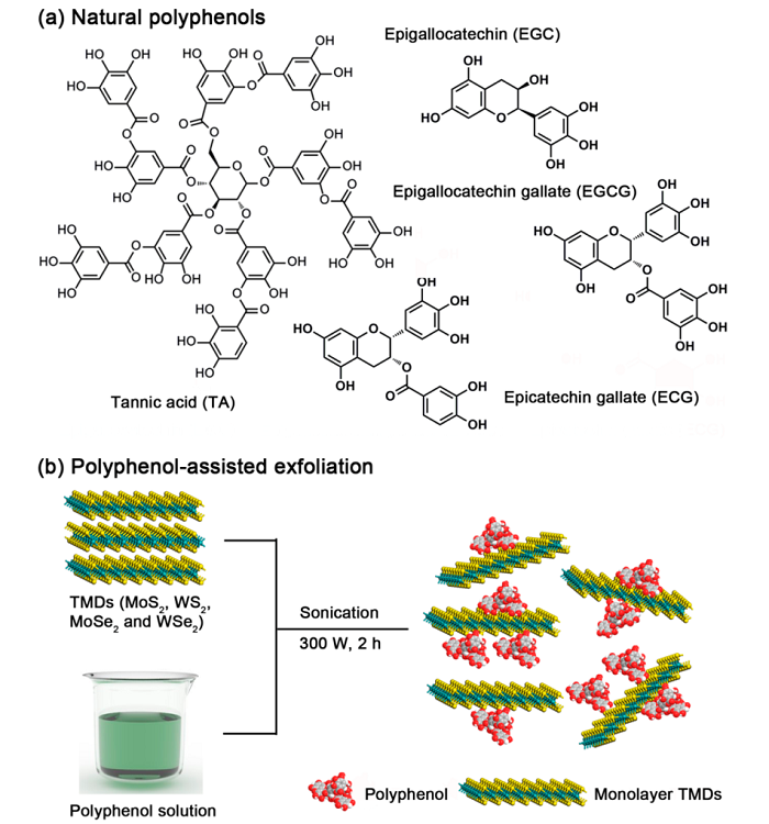 b)多酚辅助TMDs的水相剥离的示意图。层状TMDs晶体是由大量单层通过弱范德华相互作用组装而成。