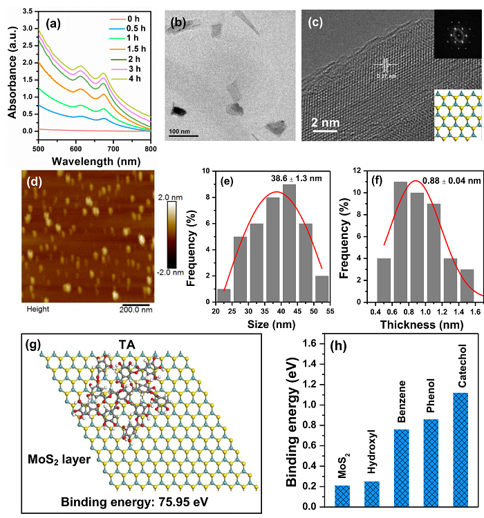 a)在不同时间点超声处理后,TA溶液中剥离的MoS2纳米片的紫外-可见吸收光谱;