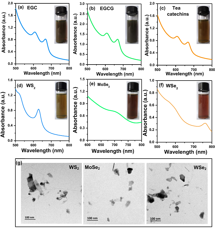 超声处理后TA溶液中的其他TMD纳米片的紫外-可见吸收光谱和相应的实物照片:(d)WS2,(e)MoSe2和(f)WSe2;